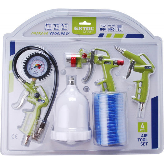 EXTOL CRAFT alap légkompresszor tartozék szett, 4db (lefuvató piszt. festékszóró, abroncsfúvó piszt.,spiráltömlő) 1/4" gyorscsatl.