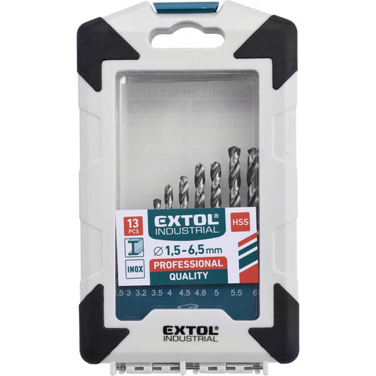 EXTOL INDUSTRIAL fémcsigafúró klt., 13db, HSS-G 9341/M2, 1,5-6,5mm, acélra, normál befogás, polírozott, műanyag tartóban
