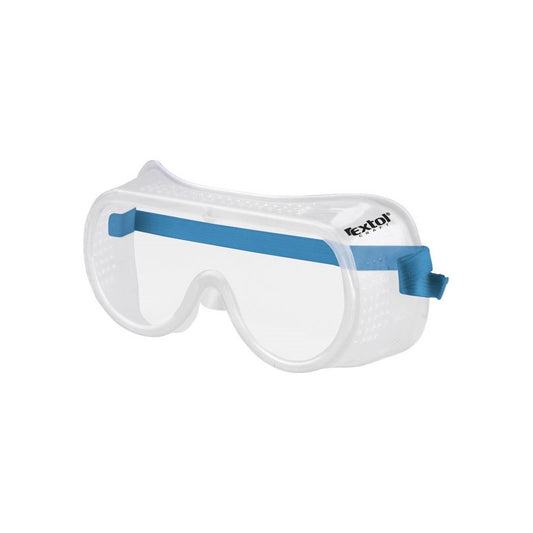 EXTOL CRAFT védőszemüveg, víztiszta, sík polikarbonát lencse, gumis fejpánt, CE, optikai osztály: 1, ütődés elleni védelmi osztály:F
