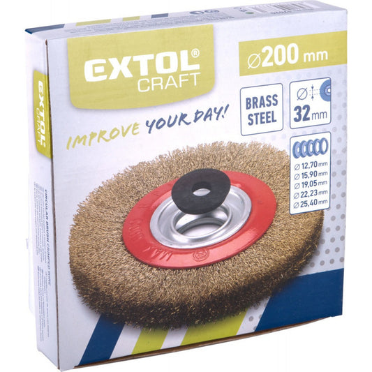 EXTOL CRAFT drótcsiszoló körkefe kettős köszörűre, 200mm, 32mm átm. műa. adapterek, hullámos szálú, rezezett acél