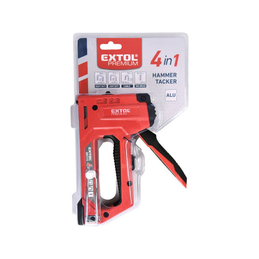 EXTOL PREMIUM tűzőgép 10,6 és 11,3mm×6-14mm, kapcsok, U-szeg és szeg,4-az-1-ben funkció; festett ALU ház, biztonsági zár