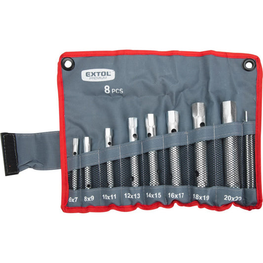 EXTOL PREMIUM csőkulcs klt., 10db (8 csőkulcs+2 hajtóvas), CrV., 6-22mm (6×7;8×9;10×11;12×13;14×15; 16×17;18×19;20×22)