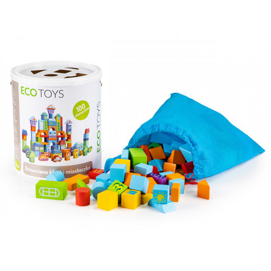 Fa oktató építőkocka város szőnyeggel 115 db ECOTOYS