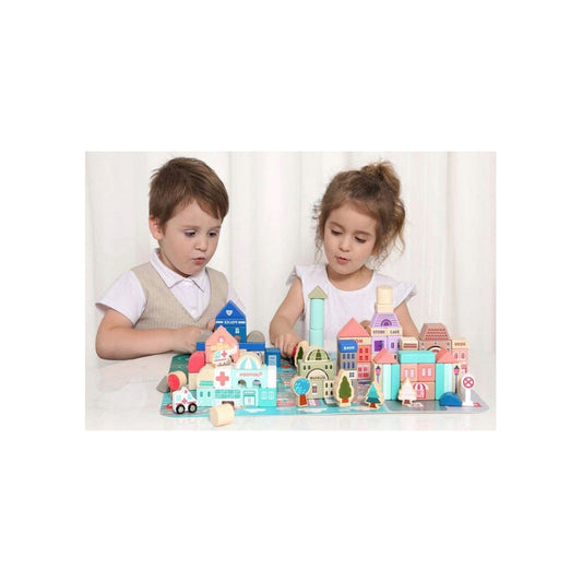 Fa oktató építőkocka város készlet szőnyeggel 88 kockával