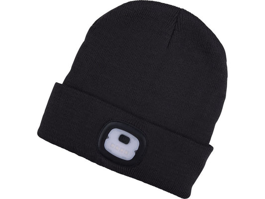 EXTOL LIGHT sapka, fekete, kötött, kivehető LED homloklámpával, 4×45 Lumen; USB tölthető Li-ion, 3funkció (100%-75%-50% fénye.)