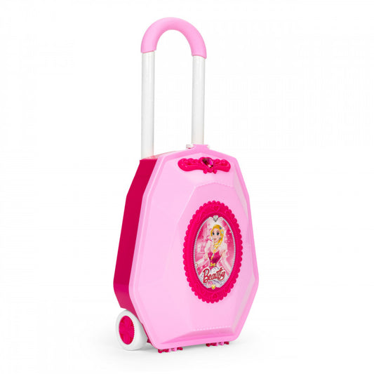 Rózsaszín gyermek kiegészítőkkel díszített fa öltözőasztal