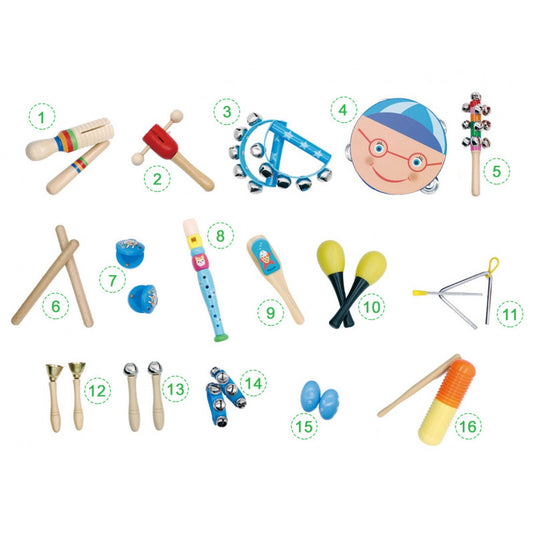 Fa hangszer játék készlet 16 db + táska ECOTOYS, hangszerek gyerekeknek, zenélés, zenei játék, hangszerszett