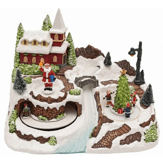 Világító karácsonyi falu, mozgó szánnal, mikulással, gyermekekkel