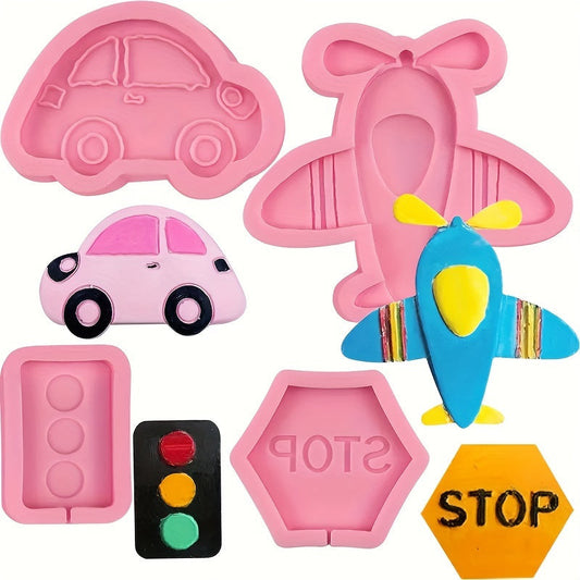 Szilikon Formák 4 részes készlet, Aranyos autó és repülőgép csokoládéformák közlekedési lámpával és Stop táblával