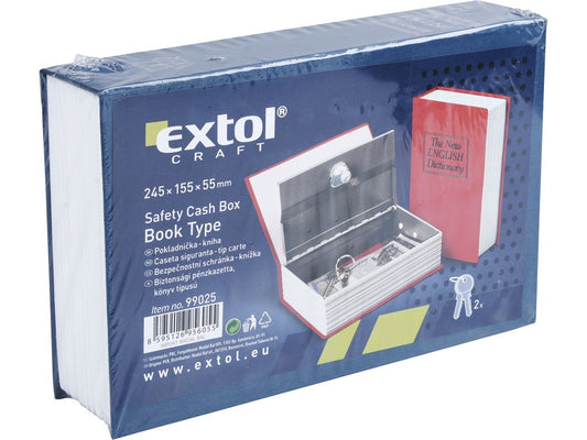EXTOL CRAFT pénzkazetta, könyv típusú, 2db kulccsal, változó színekben, festett acél, műanyag/papír borítás ; 245×155×55mm