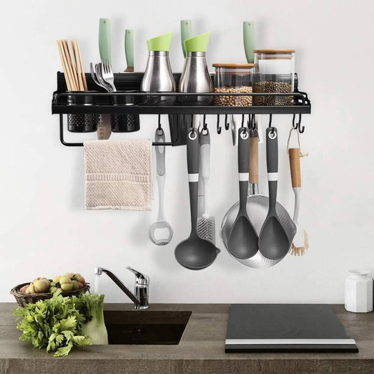 Falra szerelhető fém konyhai polc praktikus késtartóval, rendszerezővel, 10 db akasztóval (71 cm)