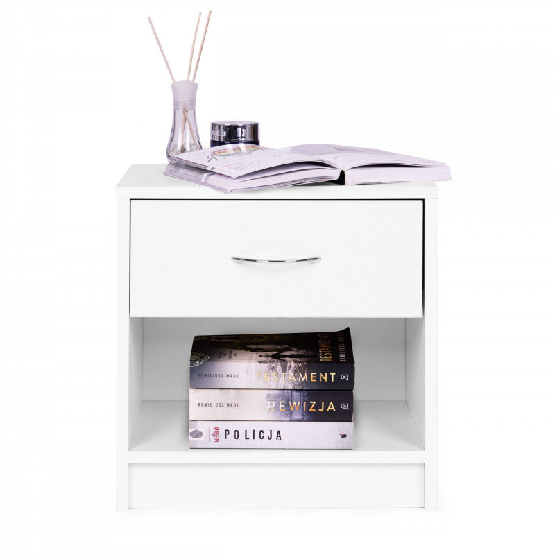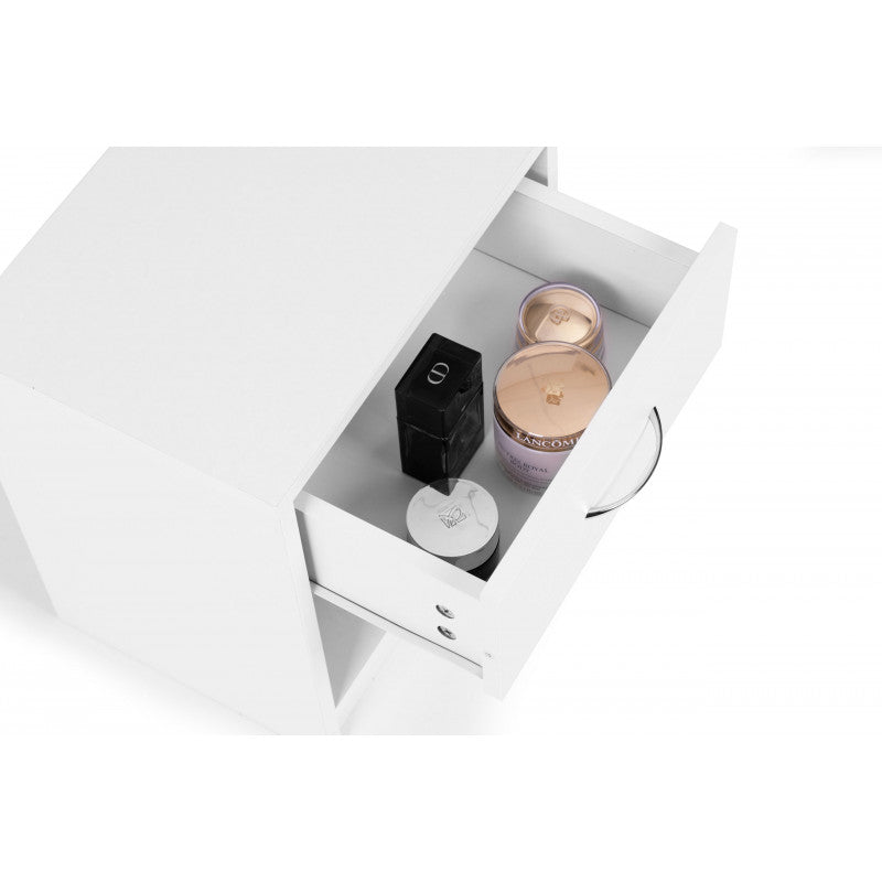 A szekrény egy tágas fiókból és egy rekeszből áll, amely lehetővé teszi, hogy tárold a könyveket, magazinokat, dokumentumokat vagy más kisebb tárgyakat, amelyeket szívesen kéznél tartanál.