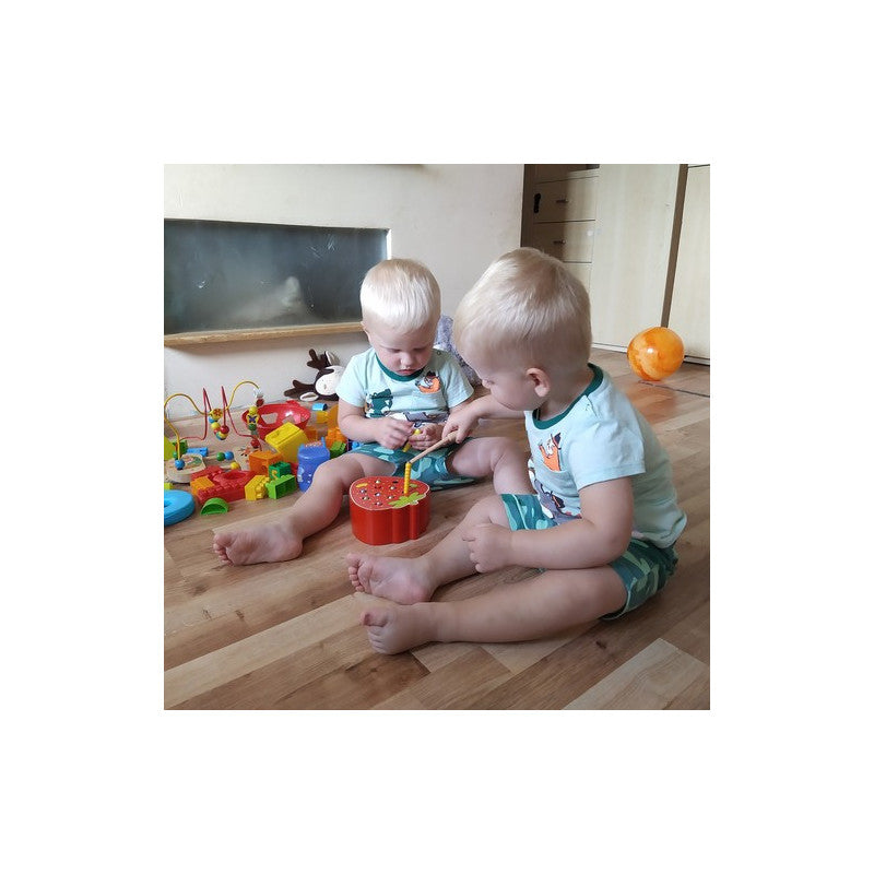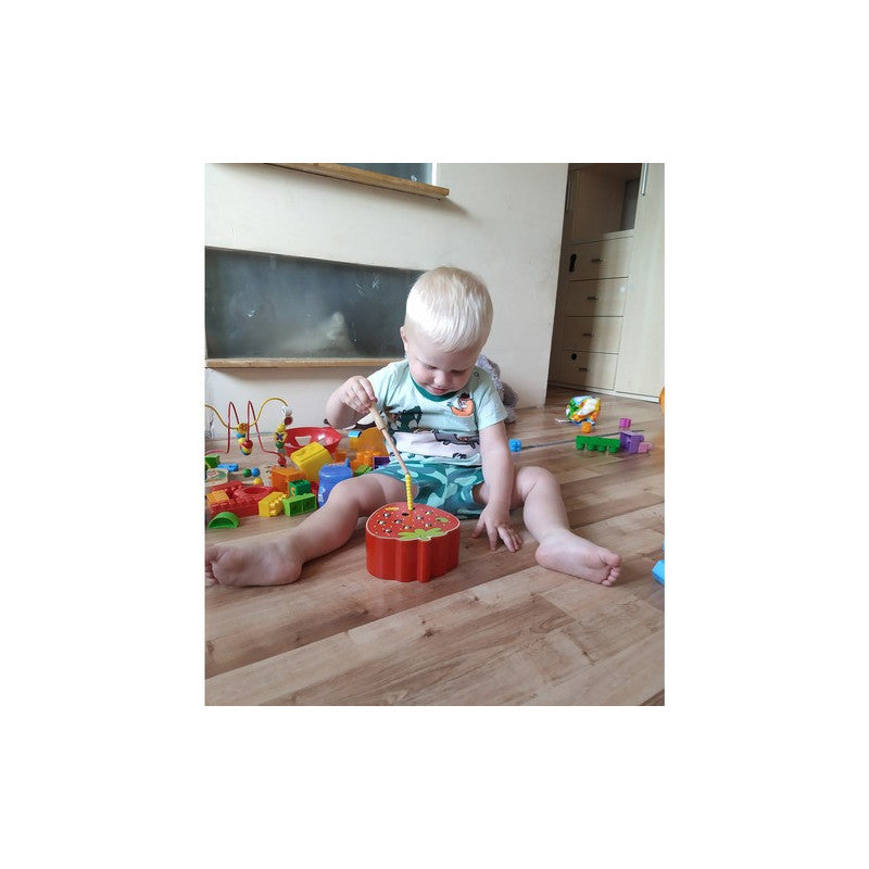 A gyermekek legjobban játék közben tanulnak. Ez a fa "fogd meg a férget" játék garantáltan mosolyt csal a gyerkőc arcára, miközben fejleszti motorikus (mozgás) és vizuális képességeit. A szett tartalmaz egy epret, férgeket és egy horgászbotot. Eredeti formájuk miatt a játék izgalmas és érdekes lesz.