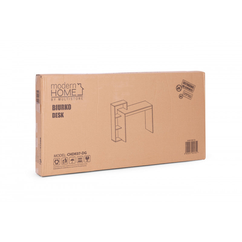 Egy modern asztal és egyszerű design az eredeti stílus és funkcionalitás szerelmeseinek ajánlott. Az asztallap és polcok forgácslapból készülnek, szürke lamináttal borítva. Ennek köszönhetően a bútor finoman csillog, rendkívül luxusnak tűnik.