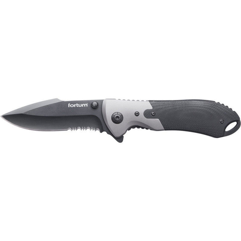 FORTUM zsebkés, rozsdamentes fekete pengével, teljes/összecsukott hossz:207/120mm, ALU/műa. nyél, övre akasztható, rögzítővel