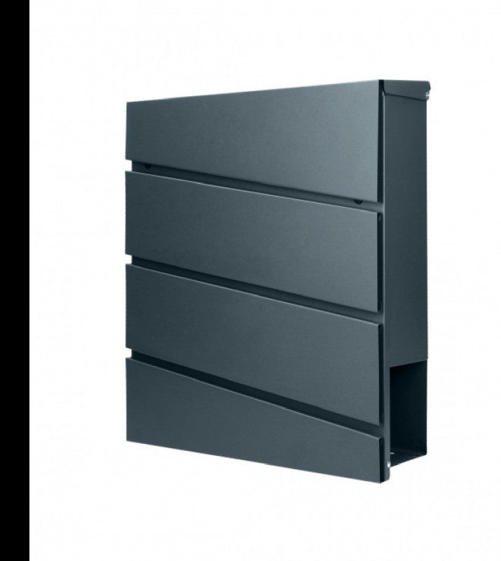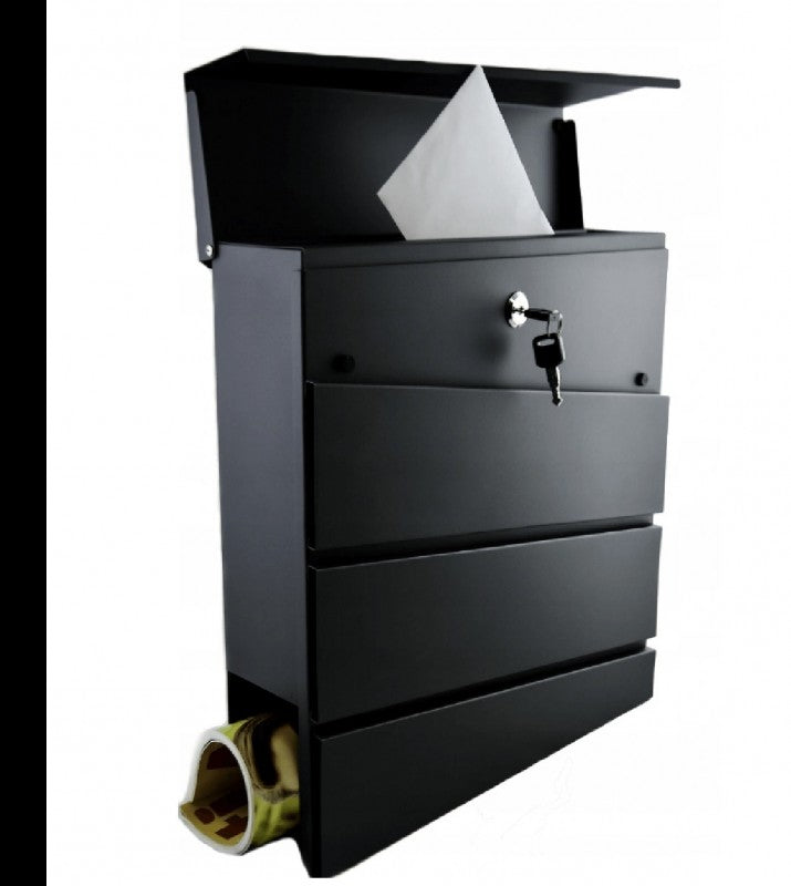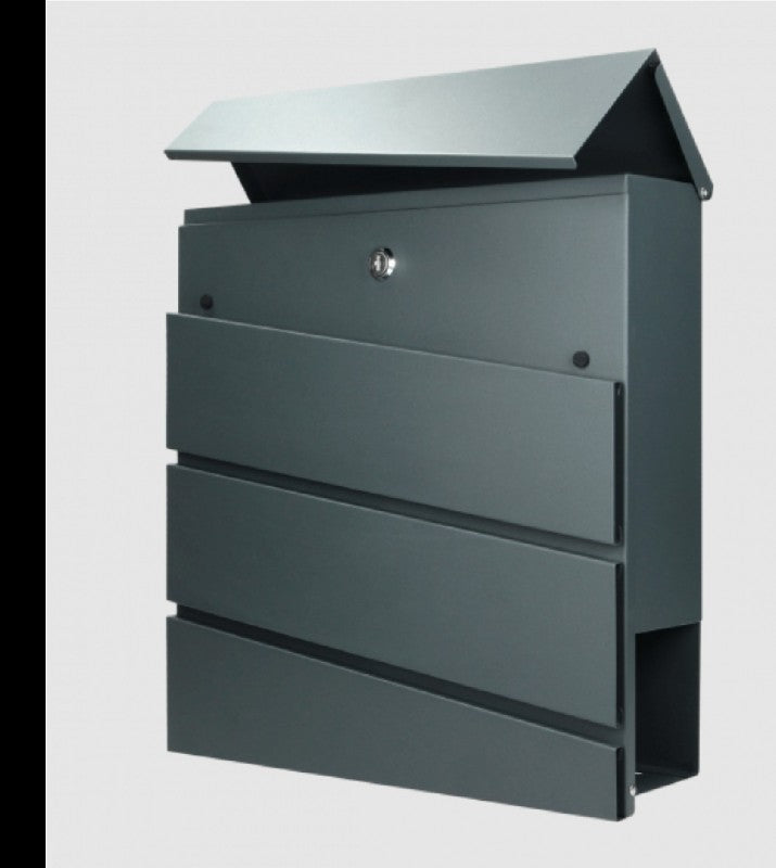 Modern postaláda, amely formájával vonzza a figyelmet. Alkalmas beltéri és külső homlokzatra vagy kerítésre történő felszerelésre. Nagy méretének köszönhetően a doboz nagyon tágas, és könnyen elfér benne A4-es levél. A doboz alján lyukak találhatók, amelyek elvezetik a nedvességet, és megvédik a leveleket a nedvesedéstől. A burkolat galvanizált, porszórt acélból készült, ami garantálja a zord időjárási körülményekkel szembeni ellenállást. A doboz kényelmesen nyitható kulccsal (2 db a készletben) és újságtartóval rendelkezik.