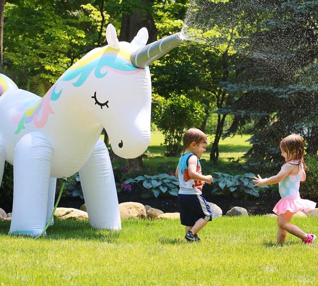 Csak fújd fel és csatlakoztasd egy szabványos kerti tömlőhöz, majd nyisd meg a vizet és az unikornis szarva frissítő vizet permetez.