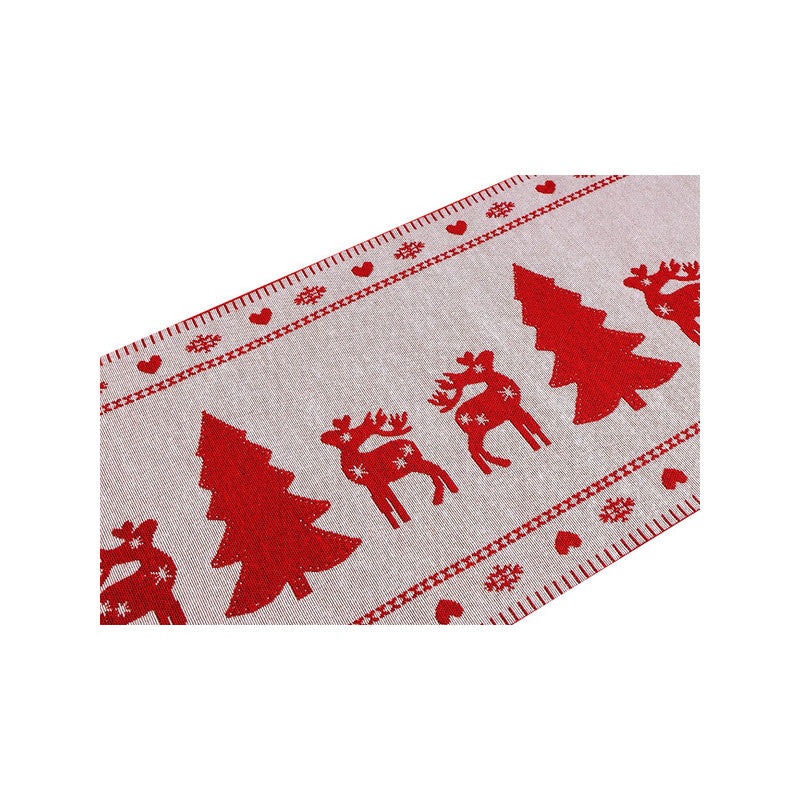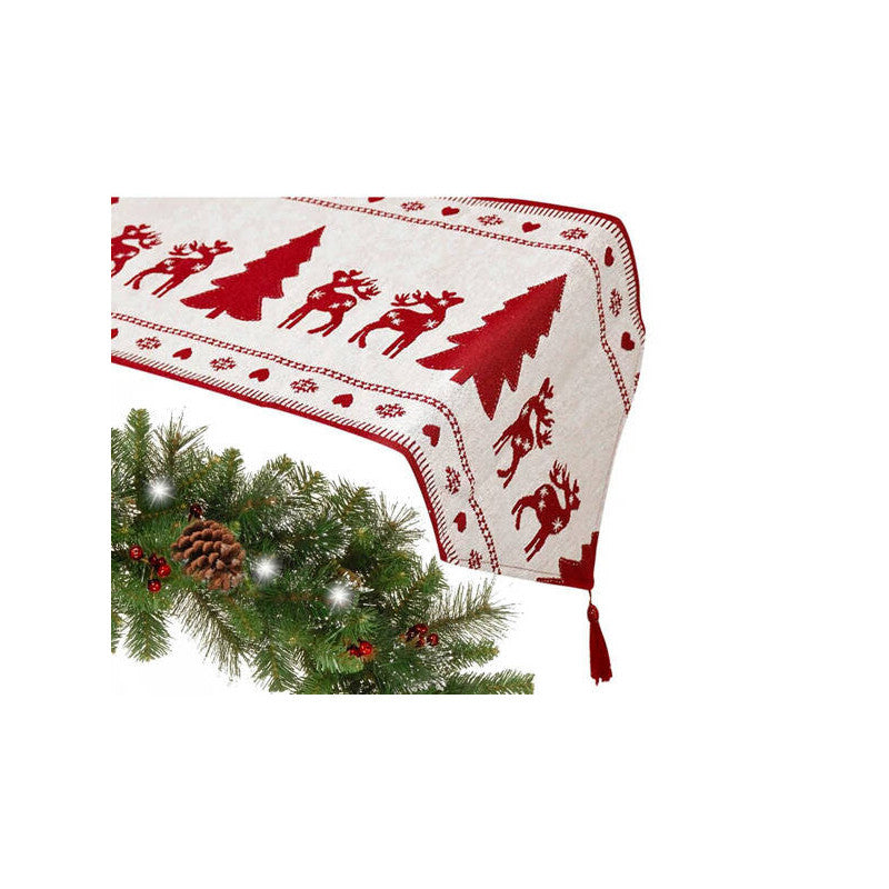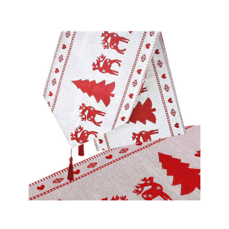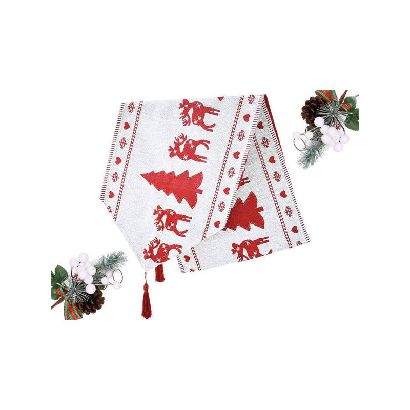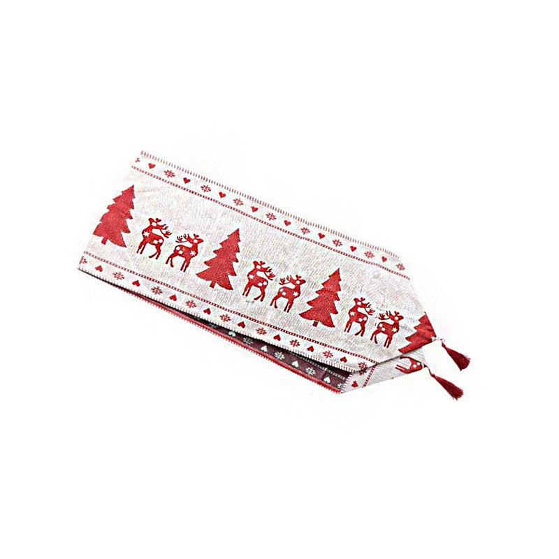 Ez a karácsonyi asztalfutó egy bájos kiegészítő lesz a karácsonyi asztalodhoz. Magas minőségű anyagokból készült, ez a gyönyörű asztalfutó eleganciát és ünnepi bájt ad az asztalodnak. Az asztalfutó tökéletes lesz az ünnepi ételekhez családoddal és barátaiddal, hozzáadva a csillogást és a melegséget. Diszkrét mintával díszített rénszarvasokkal, karácsonyfákkal, hópelyhekkel és szívekkel. Egyedi bojtokkal van ellátva. A tökéletes kiegészítője lesz egy asztalterítőnek vagy egy feltűnő kiegészítés a klasszikus fehér edényekhez. Az asztalfutó megvédi az asztalfelületet a károsodástól, foltoktól és karcolásoktól. Az asztalfutó széleit bevarrták, ami megakadályozza a szálak elszakadását, és a díszítés sok szezont fog tartani.