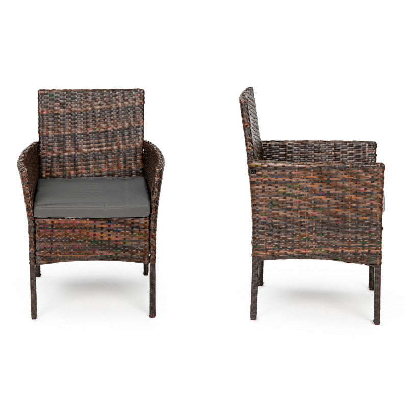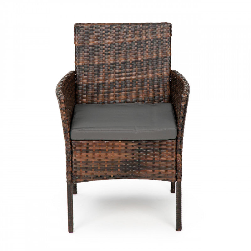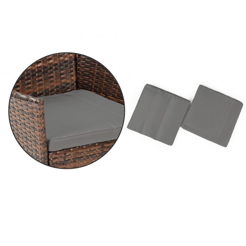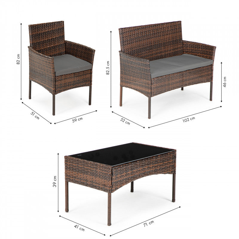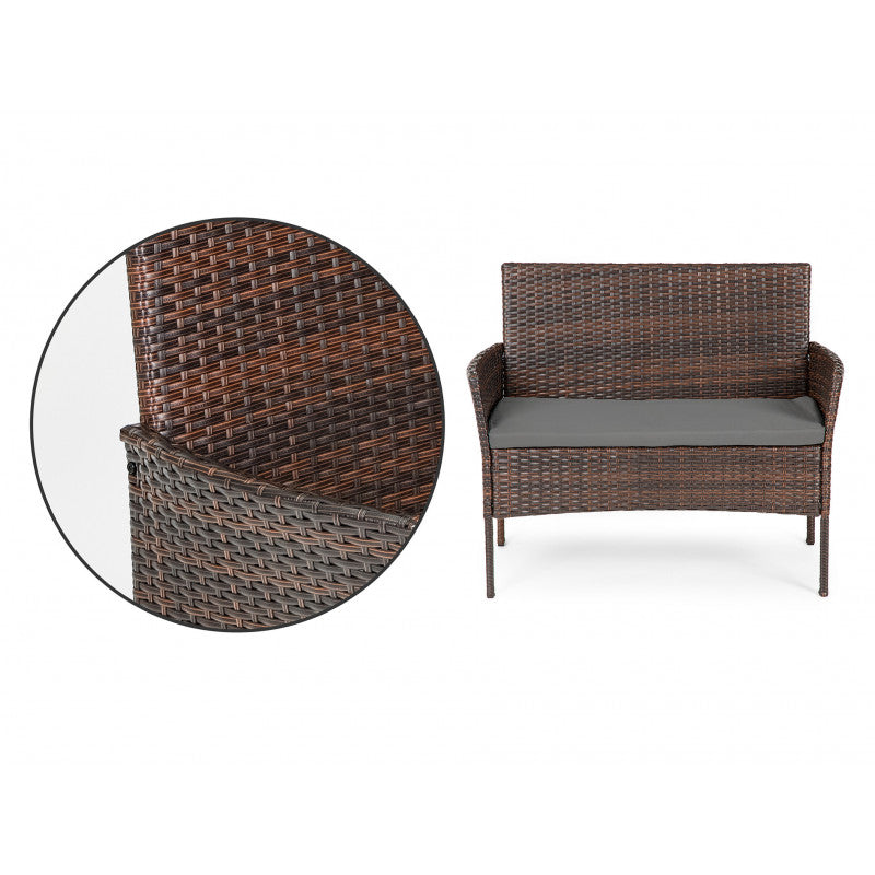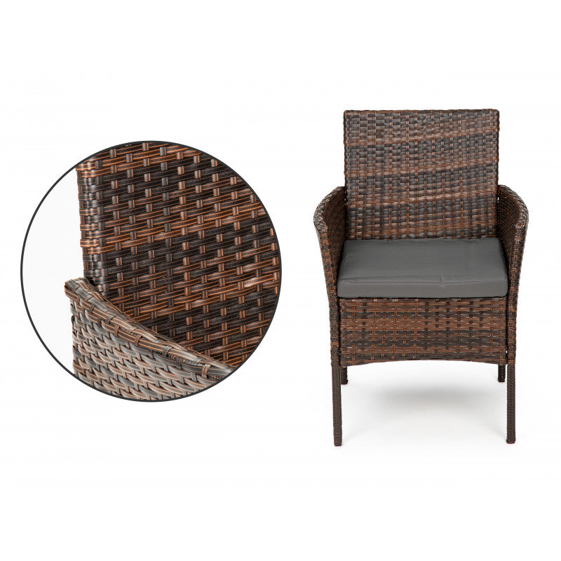 A készlet magas minőségű anyagból - technorattanból készült, amelyet a tartósság és az időjárásállóság jellemzi. A masszív fém szerkezet stabil és tartós bútorokat eredményez, amelyek garantálják a tartósságot sok szezonon keresztül. A készlet tökéletes kiegészítése lehet egy erkélynek, terasznak vagy pihenőhelynek a kertben.