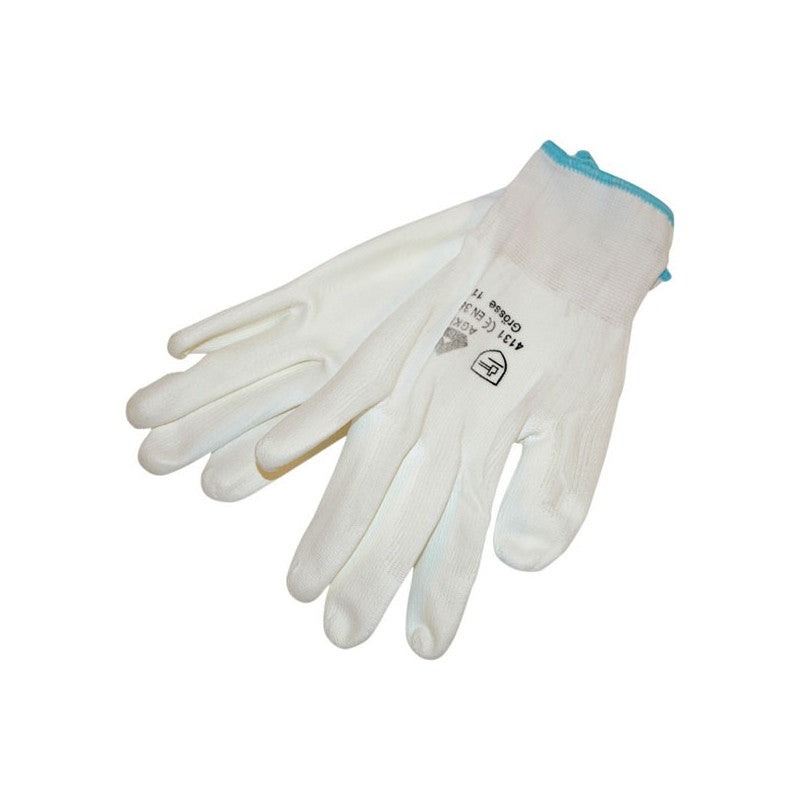 Kötött kesztyű fehér nylon, XL-es méret, 10` poliuretánba mártott teny. és ujjhegy., gumírozott mandzsetta