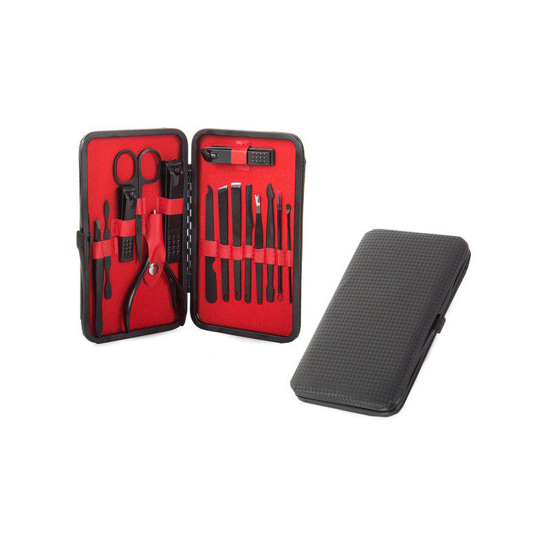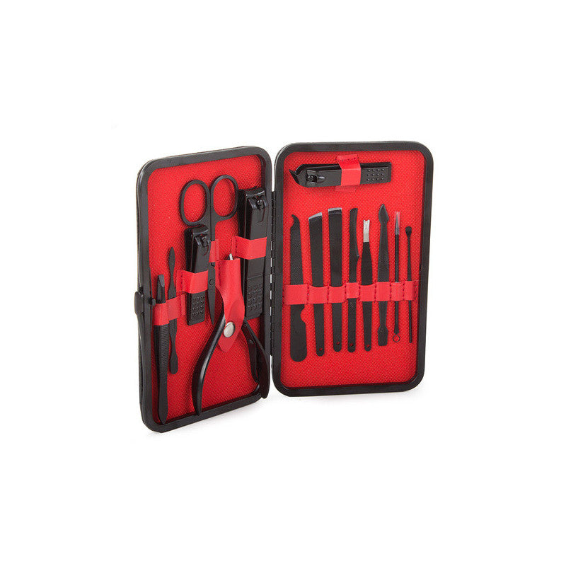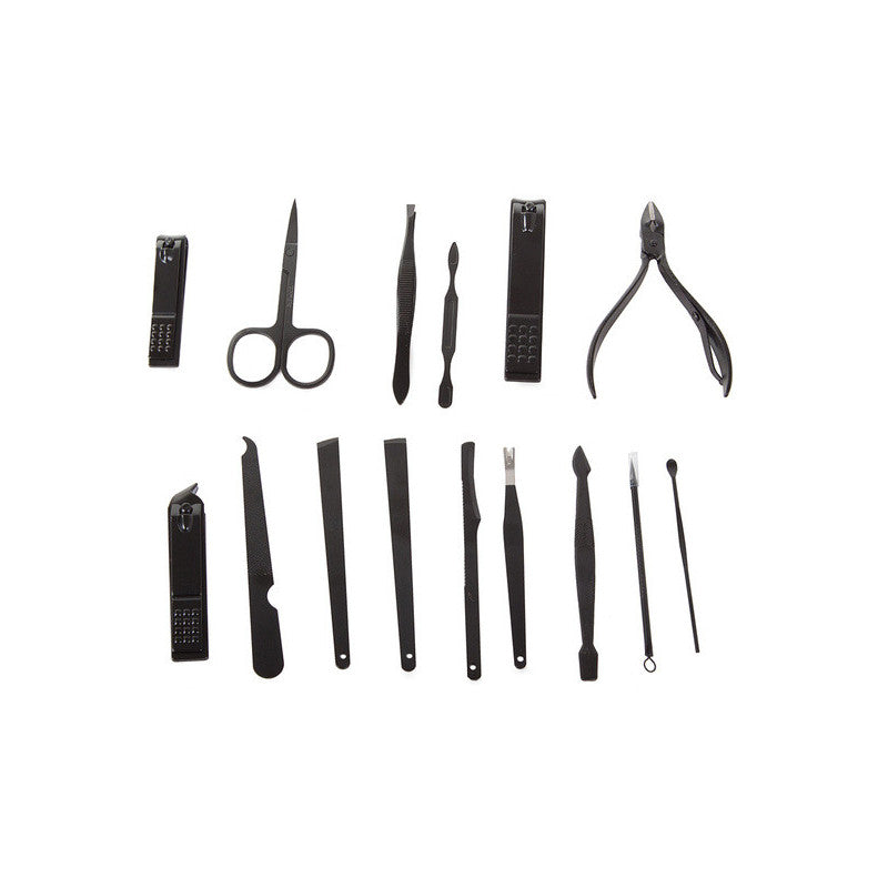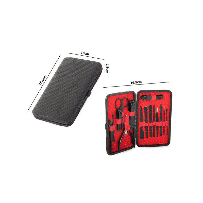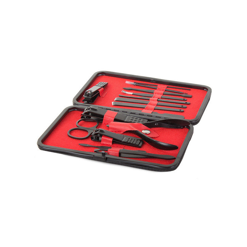 Ez a manikűrkészlet minden csajszinak kötelező darab! A készlet tartójában 16 különböző eszköz található, amelyek mindegyike tungsten acélból készült. A készlet tartós és ellenáll az elszíneződésnek. Az anyag hipoallergén, így nem okoz irritációt. Az egész készlet egy elegáns fekete tokban található, minden eszköznek külön helye van. Praktikus és könnyen pakolható kézitáskába, hátizsákba vagy utazó kozmetikai táskába. A készlet tartalmaz számos eszközt a körömápoláson kívül arcápoláshoz is.