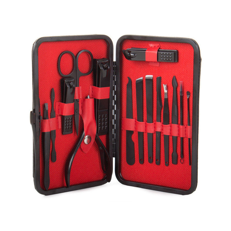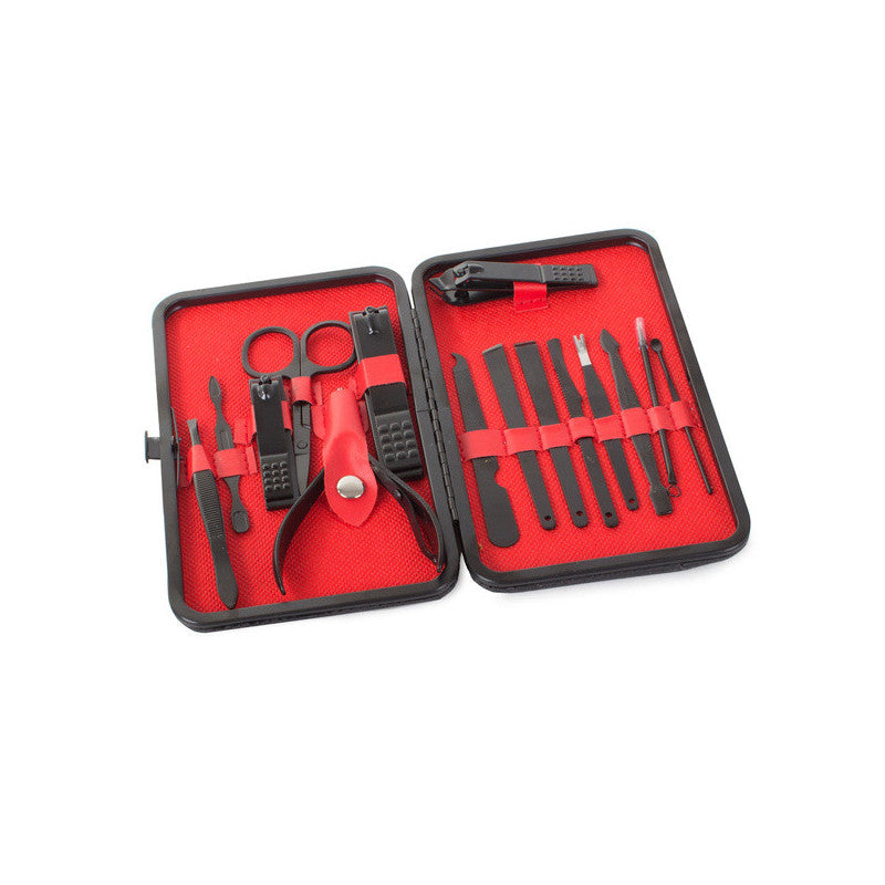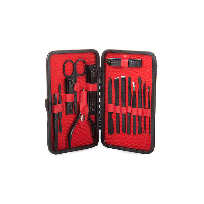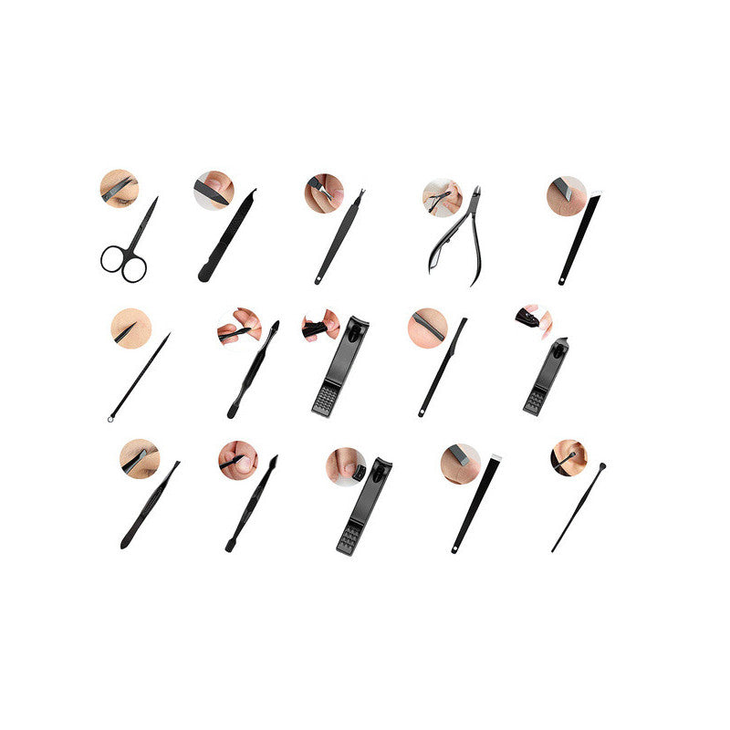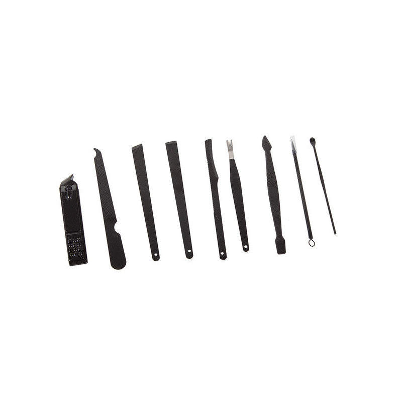 Ez a manikűrkészlet minden csajszinak kötelező darab! A készlet tartójában 16 különböző eszköz található, amelyek mindegyike tungsten acélból készült. A készlet tartós és ellenáll az elszíneződésnek. Az anyag hipoallergén, így nem okoz irritációt. Az egész készlet egy elegáns fekete tokban található, minden eszköznek külön helye van. Praktikus és könnyen pakolható kézitáskába, hátizsákba vagy utazó kozmetikai táskába. A készlet tartalmaz számos eszközt a körömápoláson kívül arcápoláshoz is.