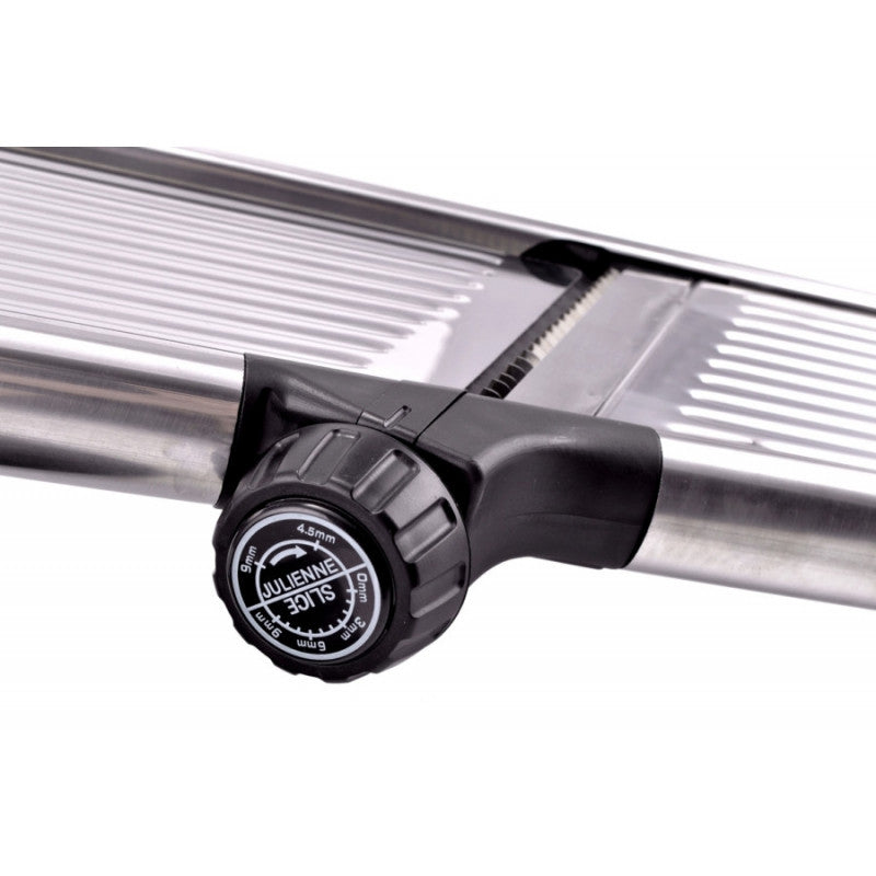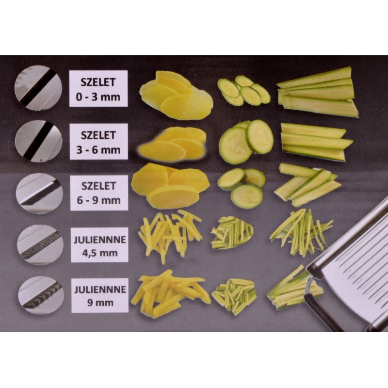 Ez a multifunkciós szeletelő számos feladatot ellát. Könnyedén beállíthatod a szelet vastagságát, választhatsz 0-3 mm, 3-6 mm vagy 6-9 mm között. Emellett képes julienne szeleteket is készíteni, 4,5 mm és 9 mm-es vastagságban.
