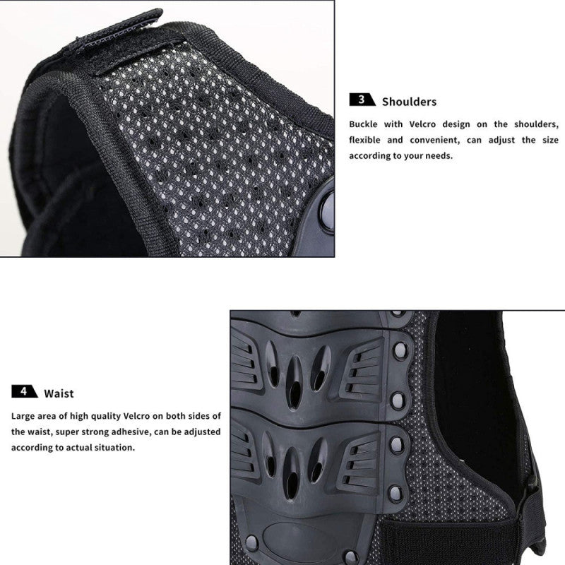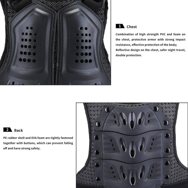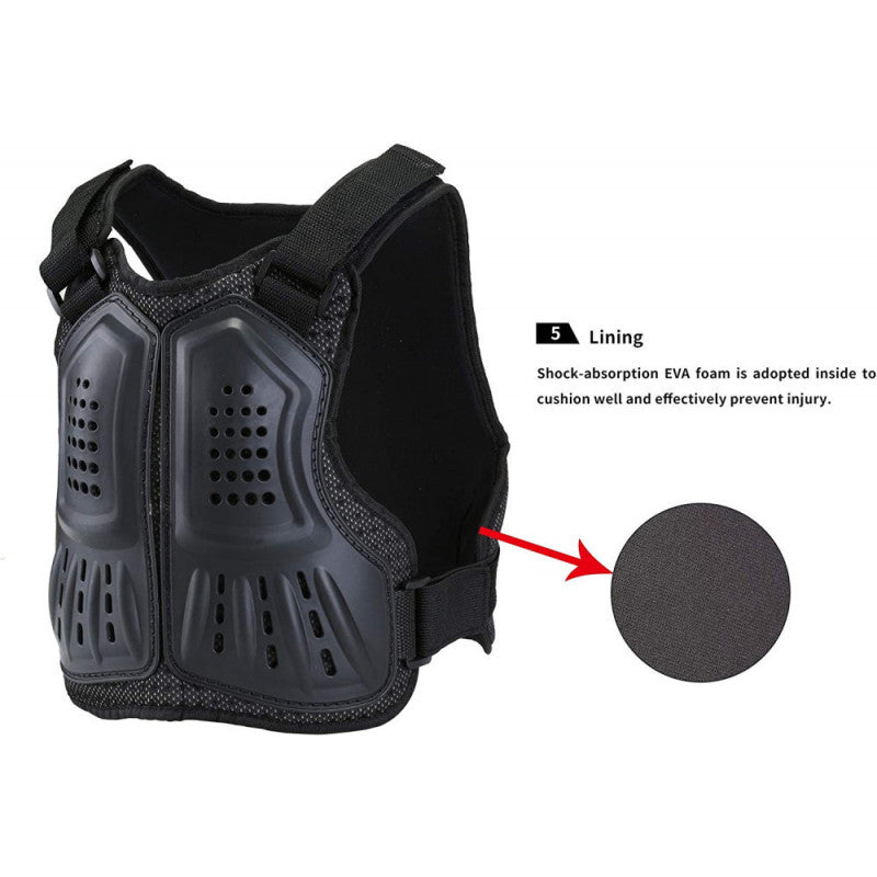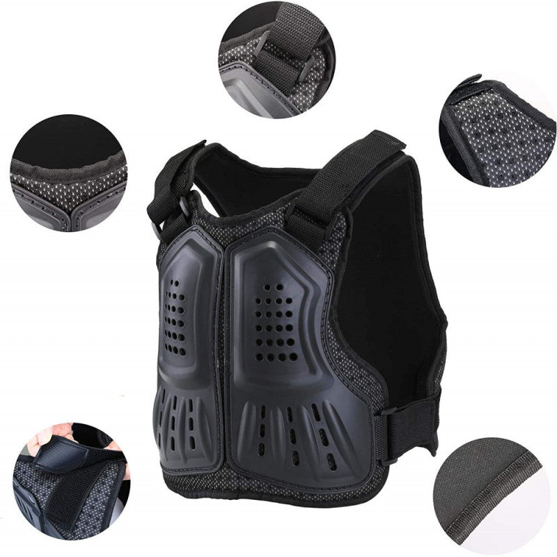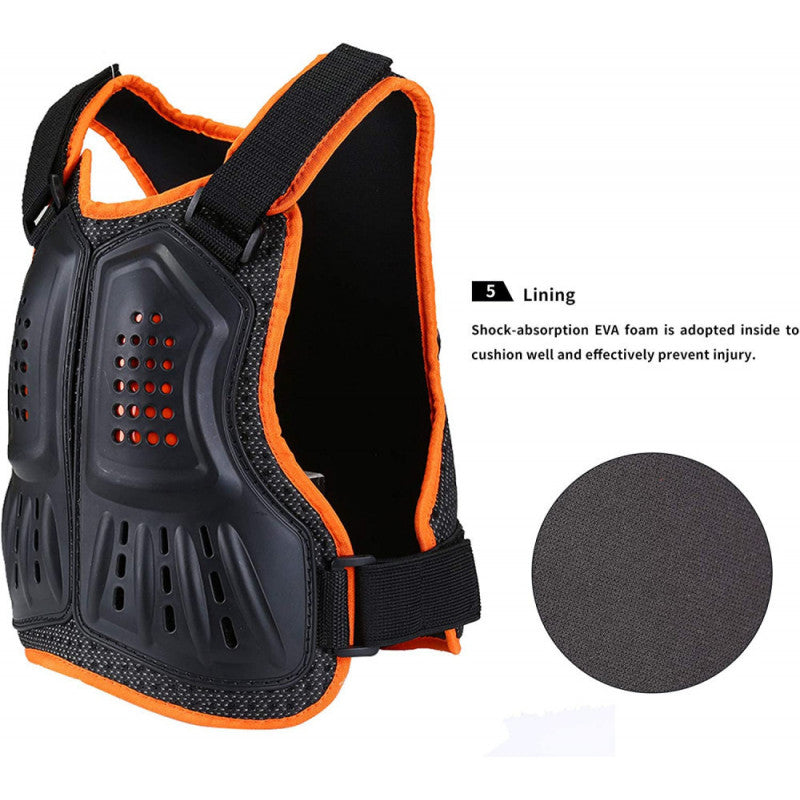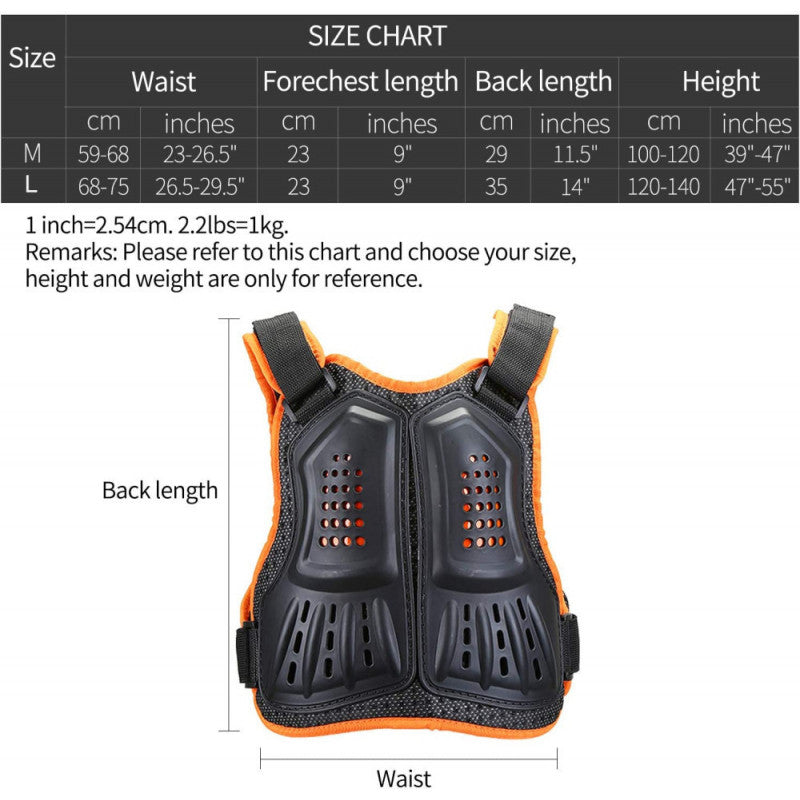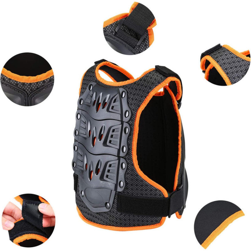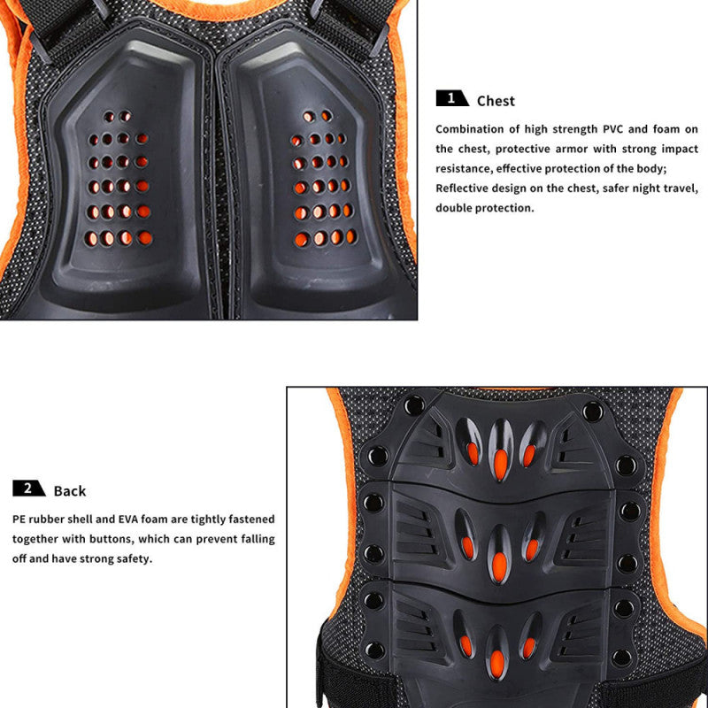 Egy olyan teljes testpáncél, amely nagy sűrűségű EVA hab, nagy rugalmasságú PVC és Lycra szövet használatával készült, hatékony védelmet nyújt a gyermekek testének fontos részei számára. A derékrész állítható, így javasolják, hogy ellenőrizze a méretadatokat, hogy a megfelelő méretű védőmellényt válassza gyermeke számára. A mellény kényelmet és védelmet nyújt gyermekeinek, miközben sportolnak. A mellvédő nagyon könnyen hordható, szellőző kialakítással rendelkezik, kényelmes és rugalmas, így lehetővé teszi, hogy az egész test mentes legyen az akadályoktól, és kellemes hőmérsékletű maradjon. Az ergonomikus, aktív kialakítás drapírozási technikával védi a fontos testrészeket, miközben kényelmes és légáteresztő. A mellkas és a mellkas környéke is jól védett. A mellény többcélú, használható dirt bike, motorkerékpár, síelés, snowboard stb. sportok során. Ajánlott azoknak a szabadtéri sportok szerelmeseinek, akik védelmet keresnek mellkasuk és hátuk számára.