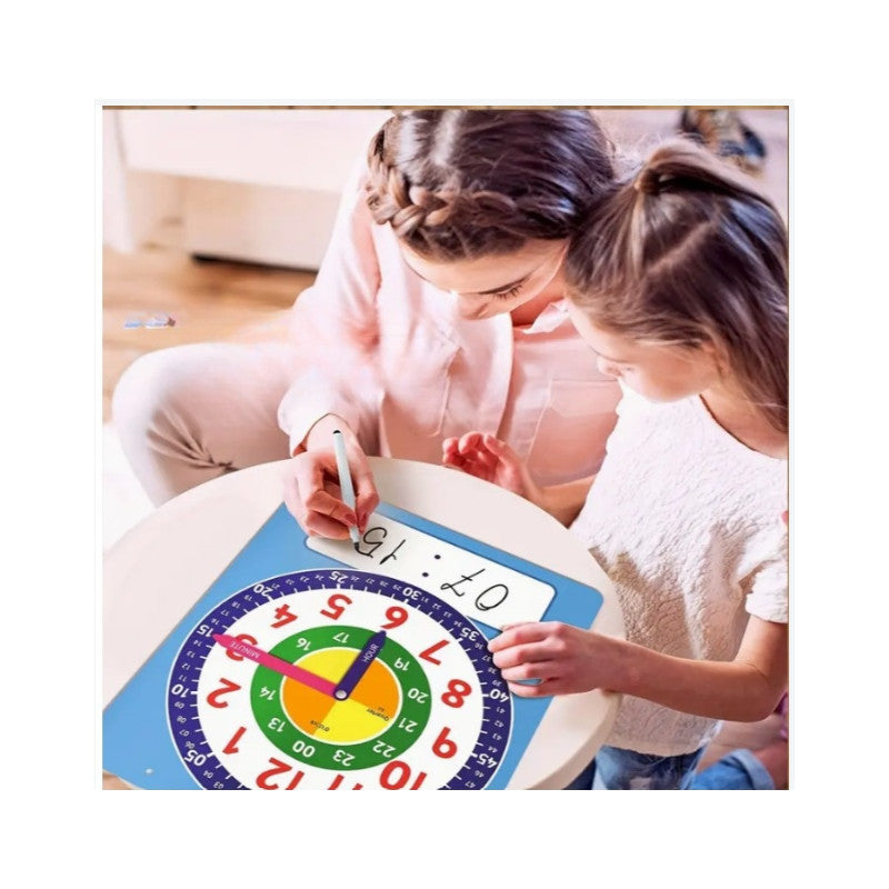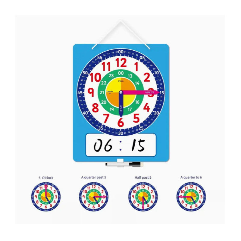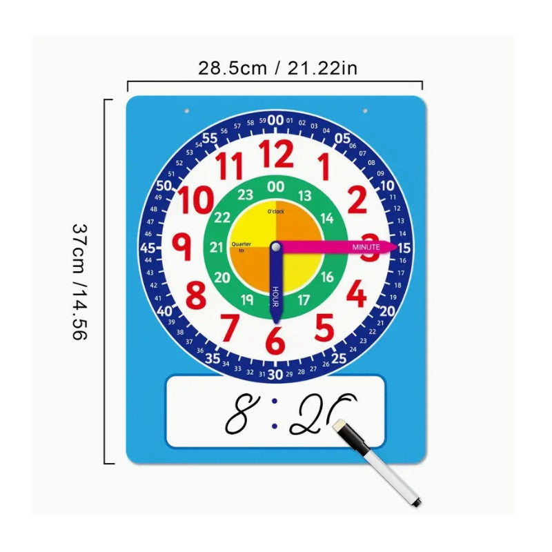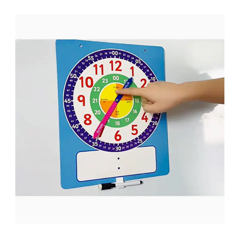 Segít megtanulni a gyermekednek az órát ezzel a könnyen olvasható és írási lehetőséggel ellátott bemutató órával. A ráírható, letörölhető óra egyértelművé és praktikussá teszi a tanítást. Az óra mozgatható műanyag mutatókkal rendelkezik, és egy hellyel a digitális idő írásához.