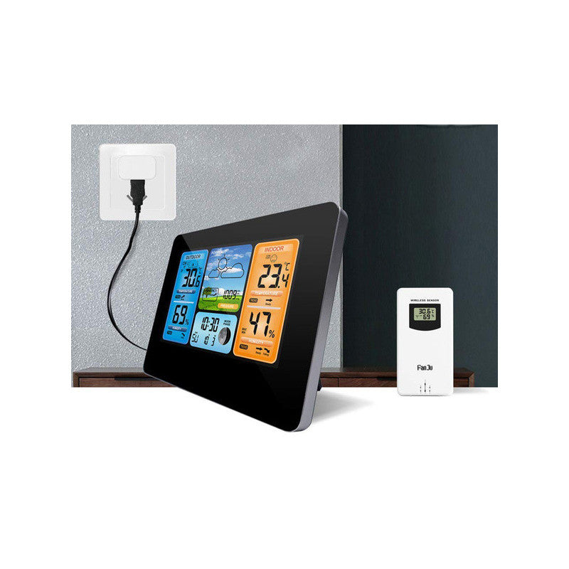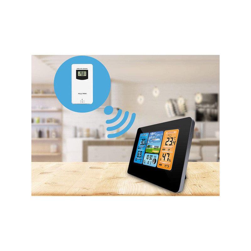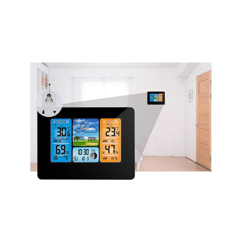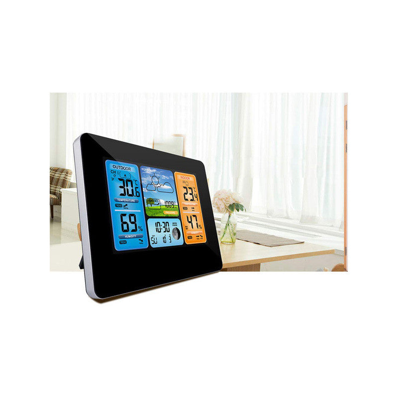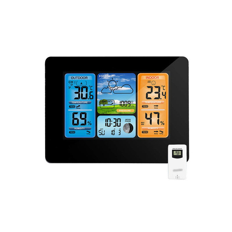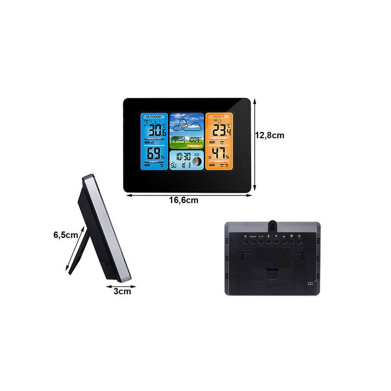 Ez a modern időjárásállomás stílusos designnal rendelkezik, ami tökéletesen passzol bármelyik szoba hangulatához. Bárhova elhelyezhető, legyen az egy szekrényen, ablakpárkányon vagy asztalon, de akár a falra is felakasztható. Ez a készülék igazán hasznos lesz sok otthonban, mert rendkívül funkcionális. A termék megmutatja nekünk a jelenlegi hőmérsékletet, páratartalmat és légnyomást (valós időben frissítve). Egy külső szenzor is tartozik hozzá, amelynek működési hatótávolsága akár 60 méter is lehet. Két LR6 AA elemmel működik, éppúgy, mint a szenzor, vagy hálózati árammal egy USB kábelen keresztül. Az állomást óraként, ébresztőóráként és naptárként is használhatjuk (a jelenlegi dátummal és a hét napjával). 7 nyelv közül választhatunk. A készülék megmutatja a hőmérsékletet és páratartalmat mind kint, mind bent a szobában. Emellett nagy és tiszta LCD kijelzővel rendelkezik, amelyről könnyedén leolvashatjuk az érdekes mutatókat. Az állomás megmutatja a holdfázisokat és rendelkezik időjárás előrejelző funkcióval.